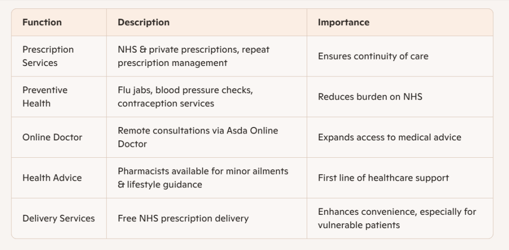 Limited Scope: Pharmacies like AsdaCare excel at routine prescriptions and minor ailments, but they cannot replace the depth of GP consultations or specialist care.